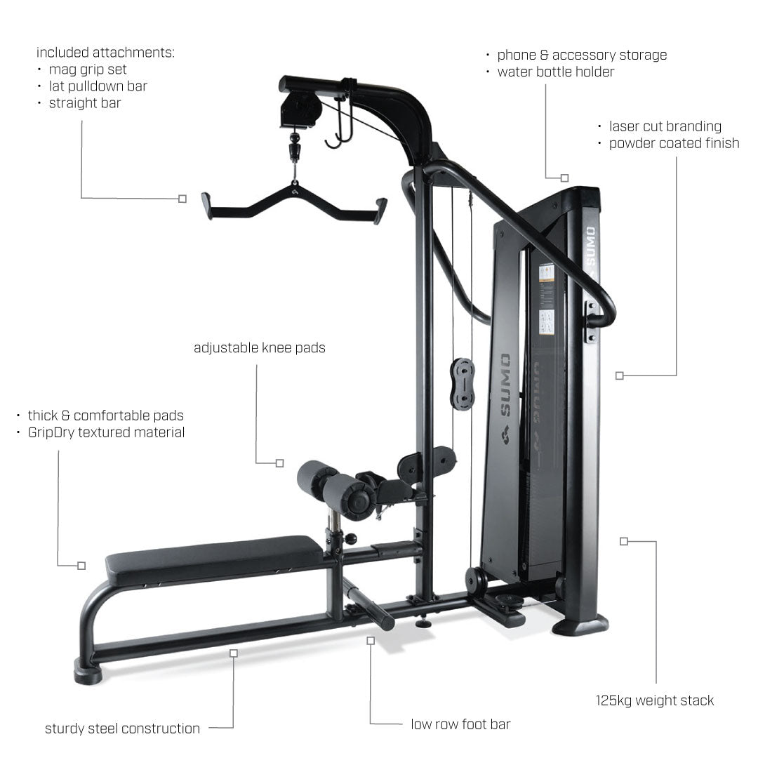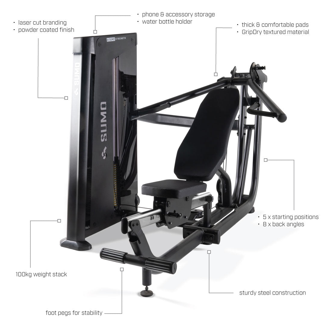 Combing a Lat Pulldown and Seated Row, you can semlessly transition between positions to train your Back with ease.