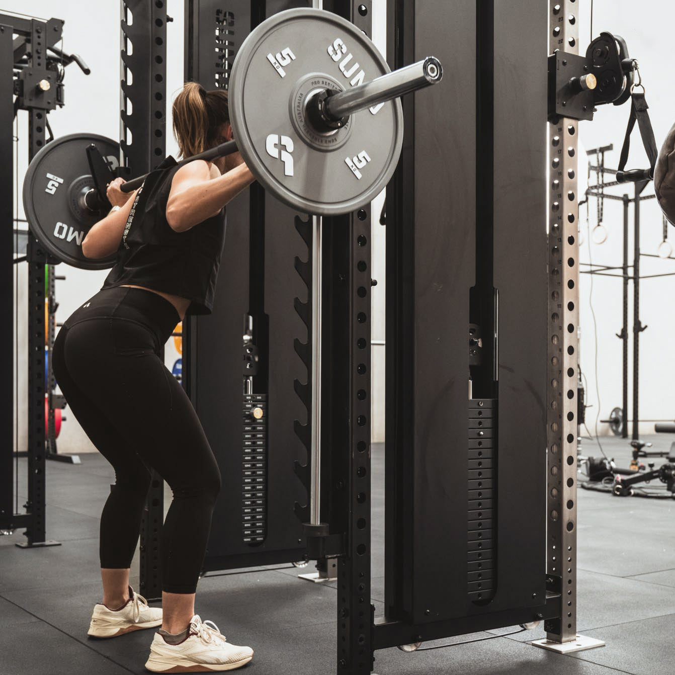 **NOTE** : When attaching the Smith Machine to the rear of your Power Rack or Functional Trainer, please ensure there’s enough room for safe and comfortable training. We recommend allowing at least 1.5-1.7 metres of clearance between the Smith Machine and any nearby wall.